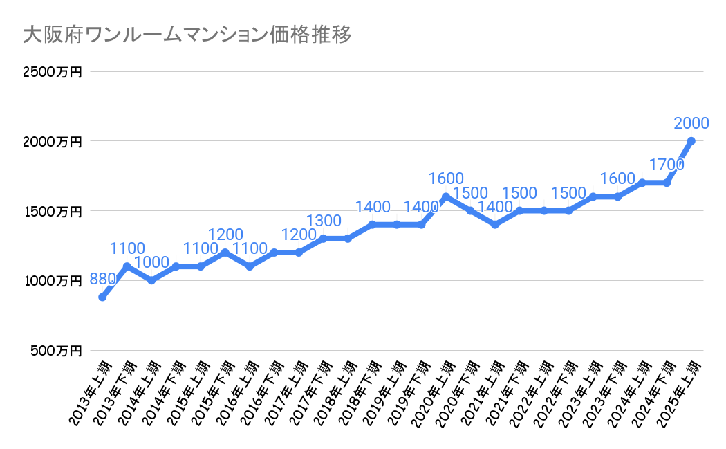 東京23区の中古ワンルームマンション成約価格は2013年上期の1,600万円から、2024年下期には2,500万円へと約56%上昇しています。