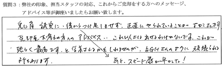 「とにかく誠実に後から付け足しをせず、正直にやられていることがよかったです。売却をお考えの方へのアドバイス‥れ以上は出せるわけがないです。これが恐らく最高です、と営業されるかもしれませんが、FGHさんのように頑張られる所もあります。」