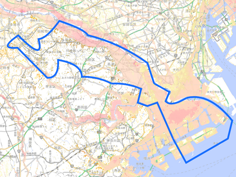 多摩川流域や東京湾沿岸部で浸水リスクが高くなっています。